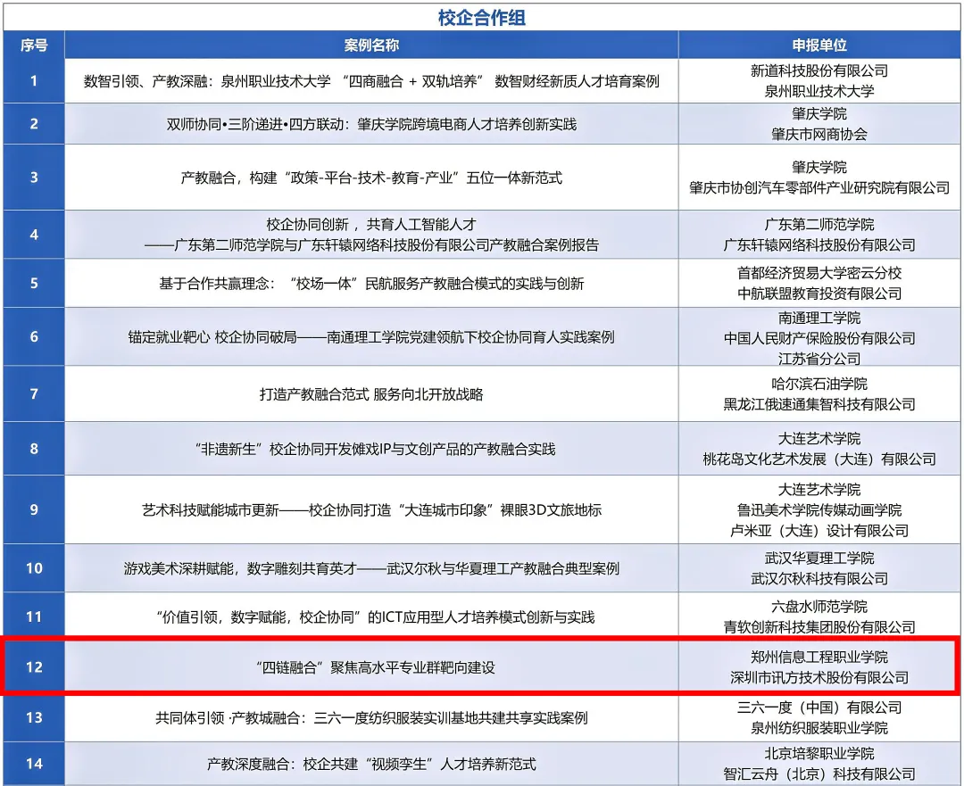 近日,大灣區(qū)產(chǎn)教聯(lián)盟發(fā)布了《關(guān)于2025產(chǎn)教融合典型案例擬入選名單的公示》,鄭州信息工程職業(yè)學(xué)院信息學(xué)院與深圳市訊方技術(shù)股份有限公司共建的案例——《“四鏈融合”聚焦高水平專業(yè)群靶向建設(shè)》成功入選,展現(xiàn)了學(xué)校在深化產(chǎn)教融合,構(gòu)建“四鏈協(xié)同”育人生態(tài)的突出成果。